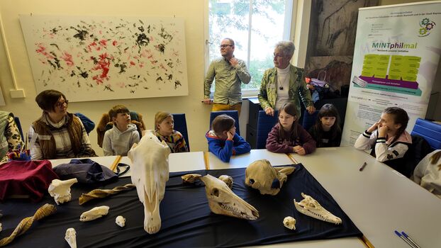 Schülerinnen und Schüler der Grundschule Meyernberg sowie Seniorinnen gingen gemeinsam einem spannenden Rätsel auf den Grund: dem Wirbeltierschädel.