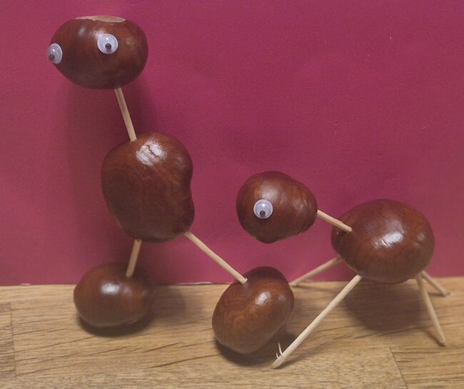 hat schon die ersten Kastanien gesammelt und zwei unterschiedliche Sorten Figuren daraus gebastelt: